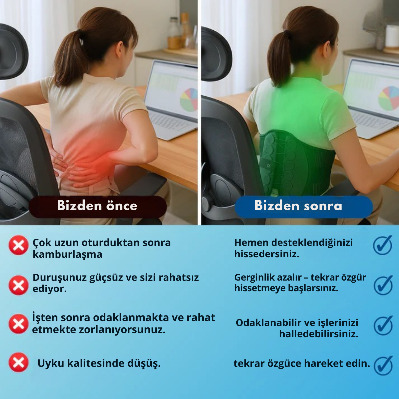 Bu ürün, günlük yaşamın her anında rahatlık ve destek sağlamak için tasarlandı. İster evde olun, ister işte veya dışarıda; omurganızı destekler, duruşunuzu güçlendirir ve hareket özgürlüğünüzü kısıtlamaz. Hafif ve nefes alabilen yapısı sayesinde gün boyu rahatça kullanılabilir, sizi yormadan omurganızı korur.